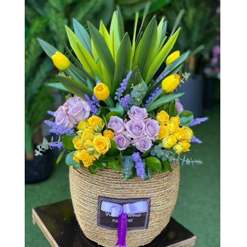 Immerse yourself in the radiant beauty of the “Sunlit Violet Bouquet,” where vibrant hues dance together in perfect harmony. This stunning arrangement features a captivating blend of deep purple and bright yellow roses, complemented by cheerful yellow tulips, all delicately nestled in a charming basket. Each blossom exudes its own unique charm, creating a picturesque display that evokes feelings of joy and warmth.